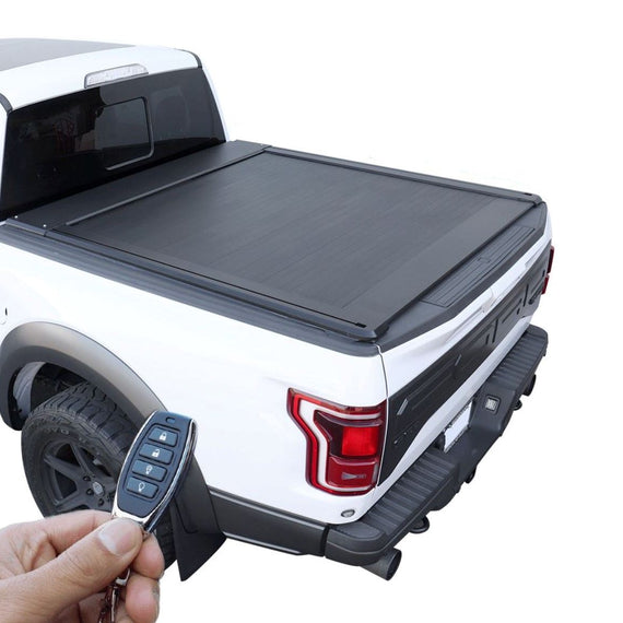 The E-power F150 Retractable cover will stop and secure in any position. The low-profile design incorporates a front cover flush with the truck bed cover, and the matte finish provides incredible scratch resistance and adds style to your truck. The E-power Ford F-150 tonneau cover is also compatible with our rack accessories thru the T-slot track on the new tonneau cover rail system.